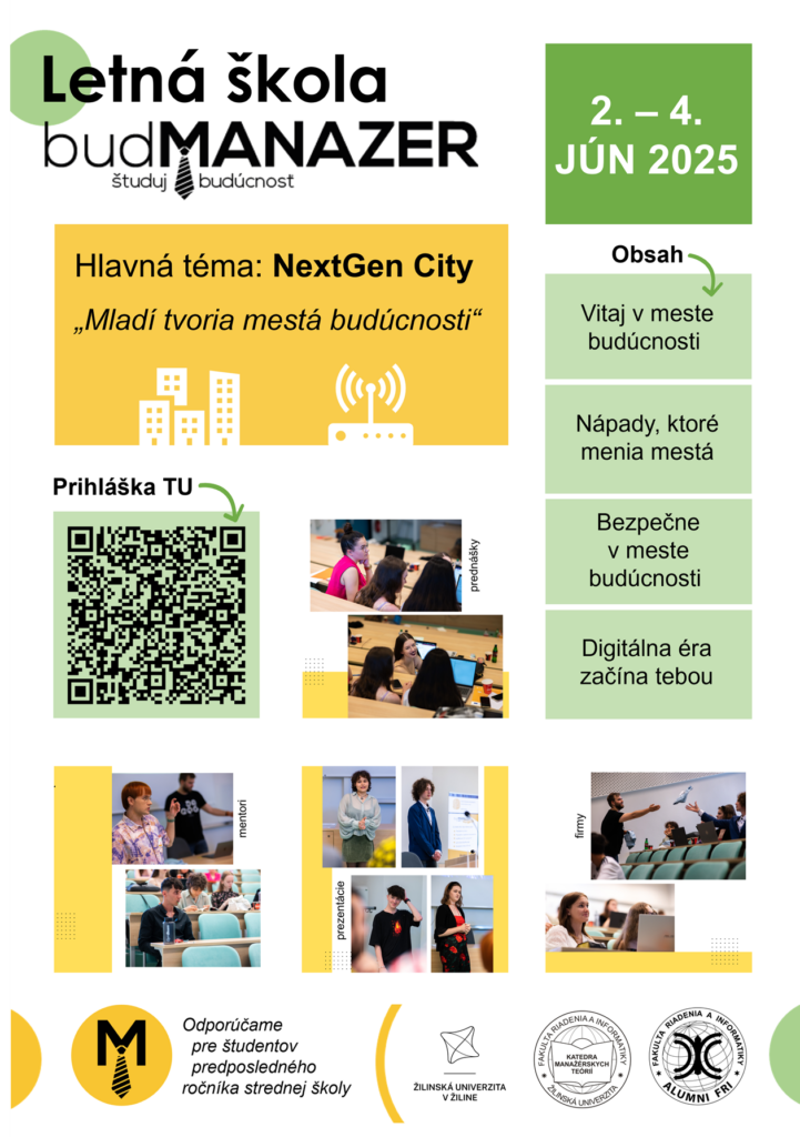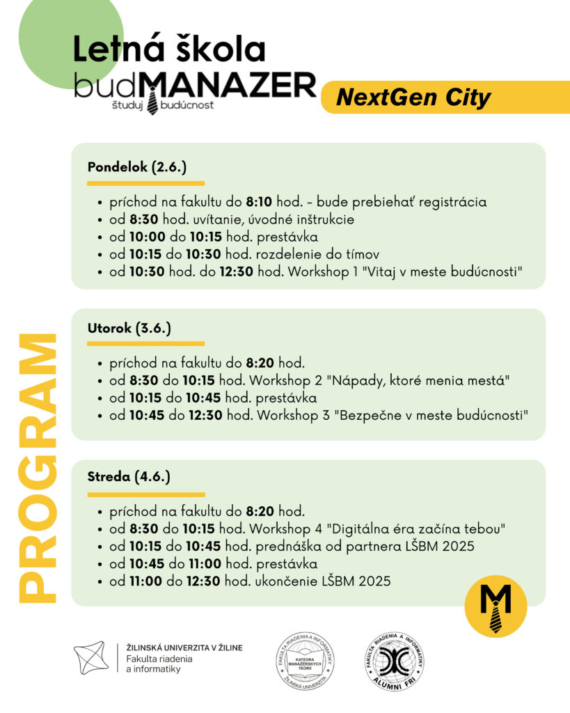 Potom je letná škola Buď manažér 2025 presne pre teba! Tento rok sa ponoríme do témy NextGen City – Mladá generácia pre budúce mestá, ktorá spája svet technológií, manažérskeho myslenia a vízií, ktoré môžu zmeniť spôsob, akým žijeme v mestách.